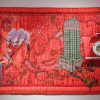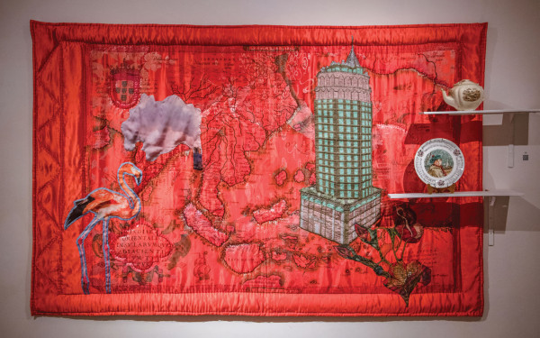 Quilt, Fabric Collage, Markers, Embroidery on Chinese Silk Brocade with American Wool Object: Johnson Brothers Teapot and Royal Doulton Plate